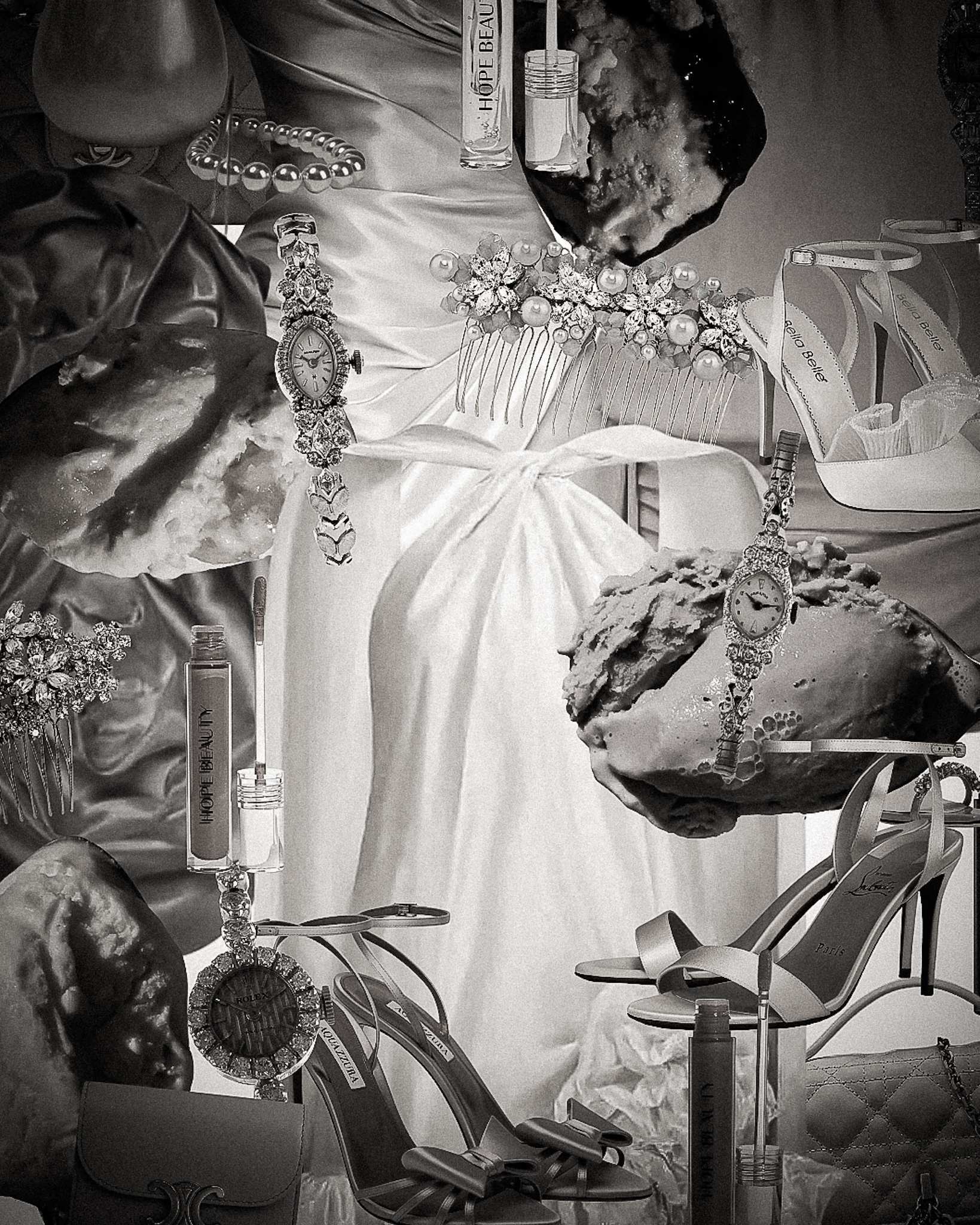 But, paired with a creamy Dior purse with a sprinkle of gold hardware, ruffled Bella Belle heels, and another shade of Hope Beauty’s creamy lip gloss, it’s even better. A stunning Gabriella flowered comb from Ellen Hunter NYC rounds out the ivory ensemble, while a vintage Bulova cocktail watch from Louis Martin is the figurative cherry on top.