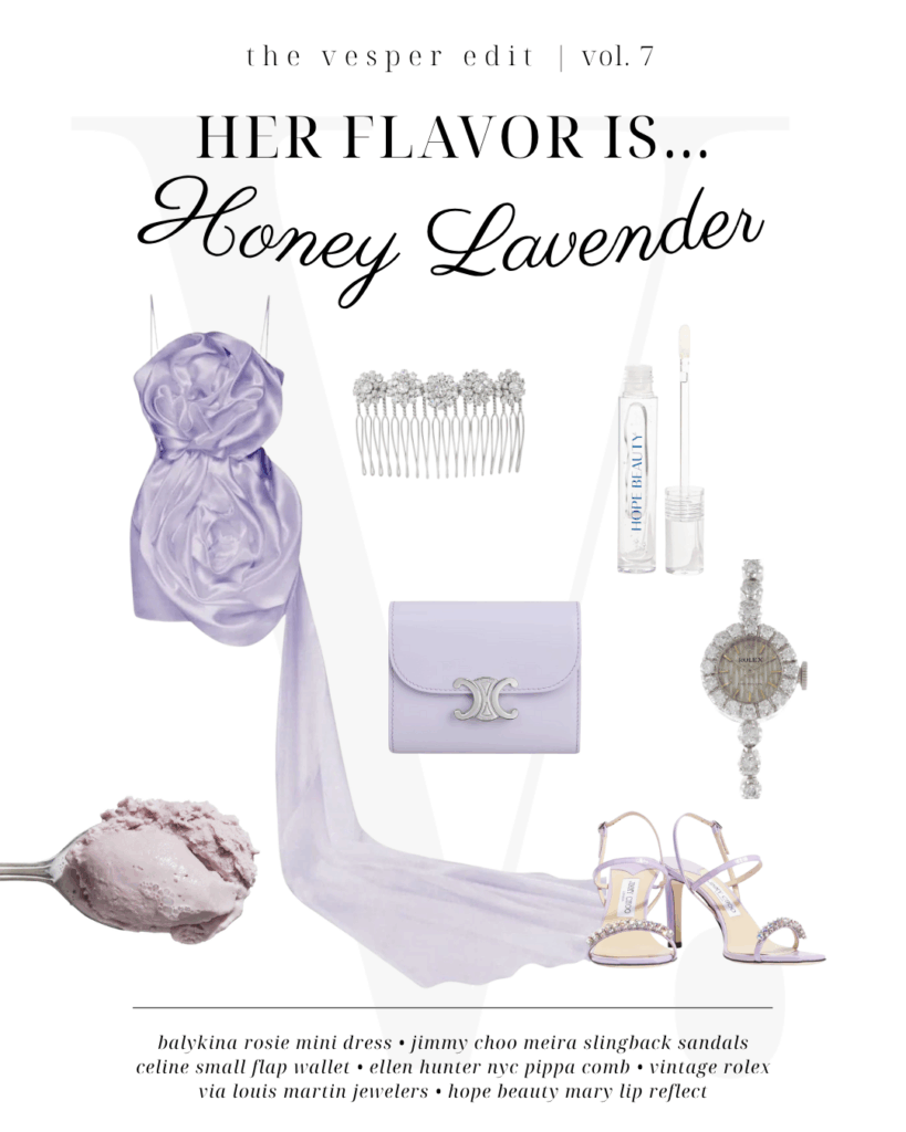 Fragrant and floral, Honey Lavender is one of Salt & Straw’s enduring flavors. Sweet but not soapy, the flavor calls to mind a stroll through French Provence or a London Fog latte with just the right amount of honey. For a flavor so enchanting, it was only fair for us to create an equally ethereal outfit in that perfect shade of purple. You’ll be eating your scoop too fast for any drips to run down your cone, but this floral-inspired lavender mini dress features a delightfully dribbling train of fine fabric to add a bit of whimsy. Shoes from Jimmy Choo sparkle with rhinestone straps reminiscent of crystallized honey, and we add even more sparkle with the bee’s knees of all watches—a vintage gold-and-diamond Rolex, circa 1930.