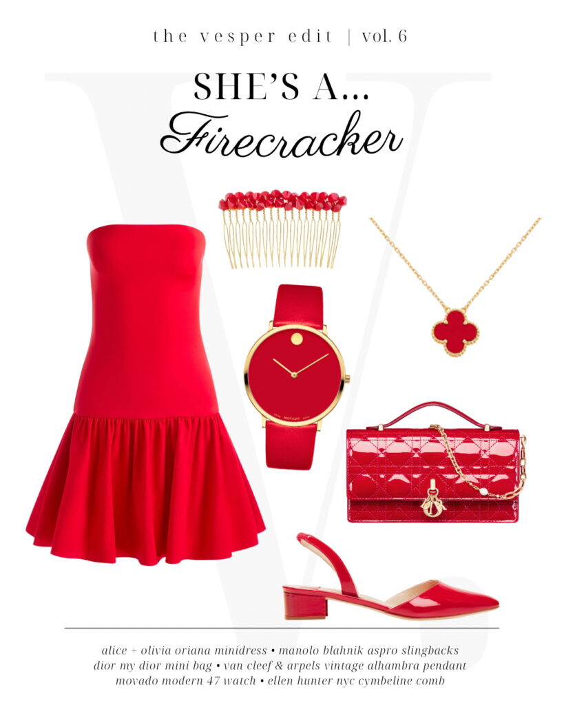 We can’t resist drop waists or ruffles, and we certainly can’t resist Alice + Olivia, making this firecracker-red bodycon a no-brainer. Prepare yourself for whistles and shouts as you parade through the party this Independence Day in shiny patent Manolo Blahnik slingbacks while carrying your matching Dior mini bag. A classic Van Cleef & Arples pendant pairs perfectly with a made-in-the USA hairpiece from Ellen Hunter NYC, and a striking monochromatic Movado watch makes certain you’ll be on time for the fireworks show.
