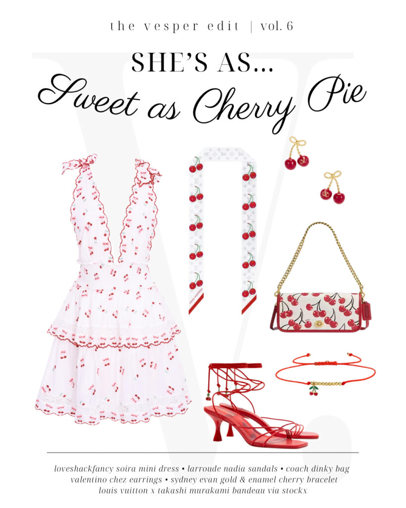Short and sweet is the name of this game, thanks to a plunging cherry-printed minidress from LoveShackFancy and matching Louis Vuitton x Takashi Murakami bandeau. Even the Larroude sandals are straight from the orchard, with their cherry-red hue and playful fruit-shaped charm, reflected by a minimalistic bracelet from Sydney Evan. Even your ears can echo “American Pie” vibes with these Valentino cherry earrings—and don’t forget the cherry-patterned handbag from Coach as you run out the door for the pie-eating contest.