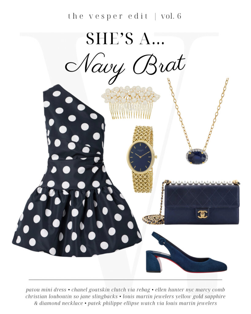 Whether or not you grew up in a military family, you can certainly appreciate this navy-hued ensemble, anchored by a stunning one-shoulder mini dress from Patou. This classy outfit might not get past a drill sergeant, but we think the quilted Chanel clutch and iconic red-soled Louboutins certainly pass muster. To help you develop a hint of that militaristic punctuality, a Patek Philippe Ellipse watch from Louis Martin Jewelers does the trick. And, while their sapphire-and-diamond necklace isn’t quite the Medal of Honor, it’s a close second. Finish the ensemble with Ellen Hunter NYC’s Marcy comb to keep your hair contained whether you’re spending the day on the water or sipping cocktails poolside.