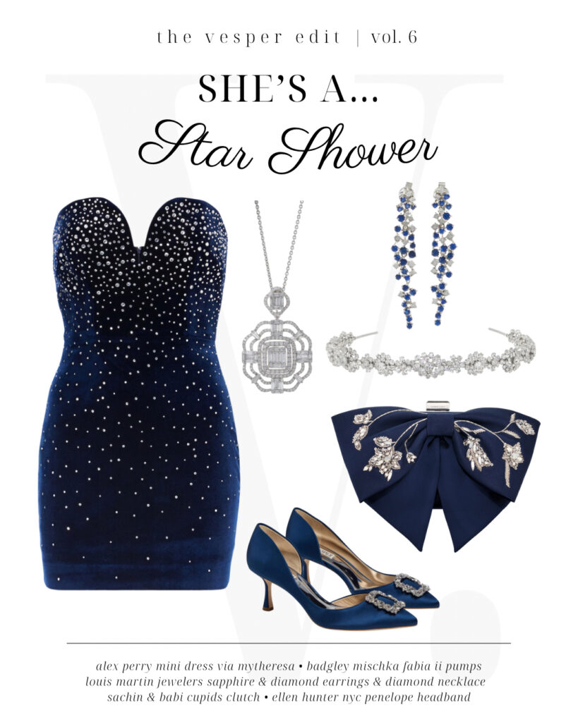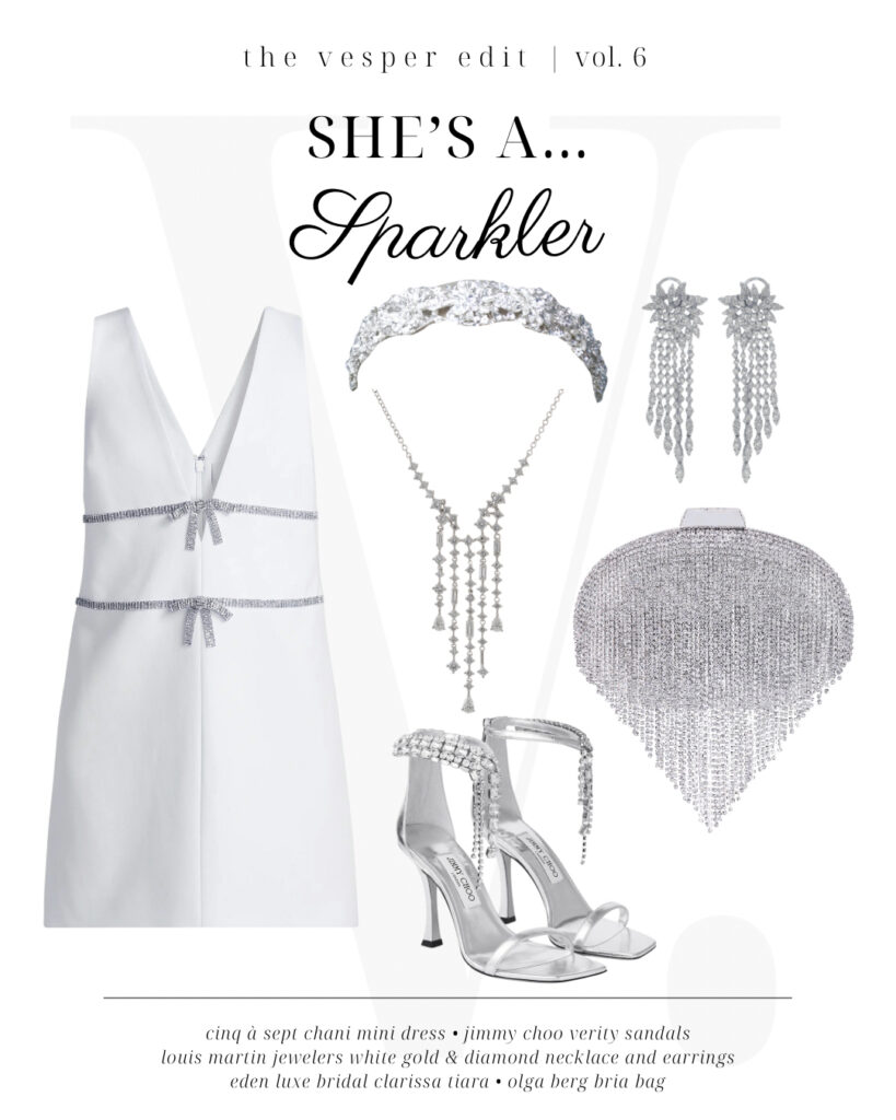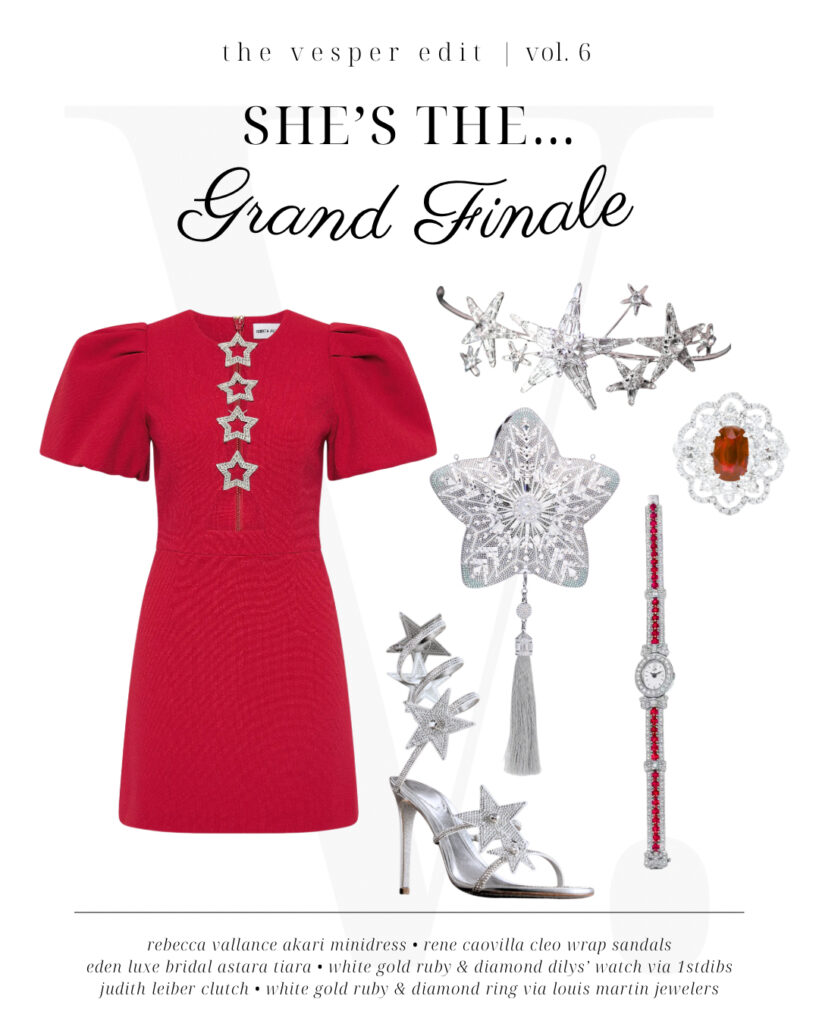 This star-spangled getup is ready to shine all night long…though we wouldn’t fault you for ditching the sky-high Renee Caovilla sandals halfway through! A bold red Rebecca Vallance minidress with a hidden cutout gives an air of classic festivity to the outfit, while diamond-and-ruby-encrusted jewels from Louis Martin (ring) and 1stDibs (watch) are ready to shine under the sun and the stars. Speaking of stars, we’re almost up to all fifty in this ensemble thanks to an on-the-nose shooting star clutch from Judith Leiber Couture and a starburst headband (ahem, tiara) from Eden Luxe Bridal. You’ll be the star of the party all through the evening!